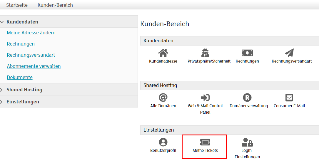Sobald Sie sich in das my.green.ch Kundenportal erfolgreich anmelden konnten, klicken Sie im Kundenbereich unter Einstellungen auf Meine Tickets.