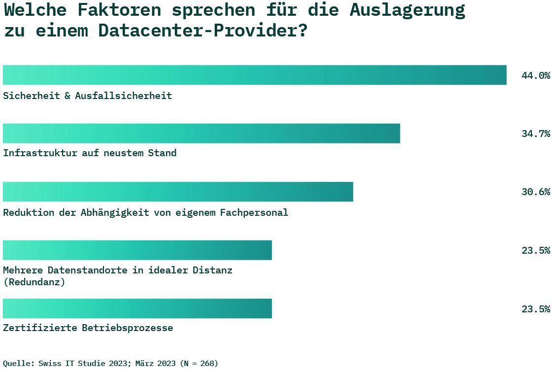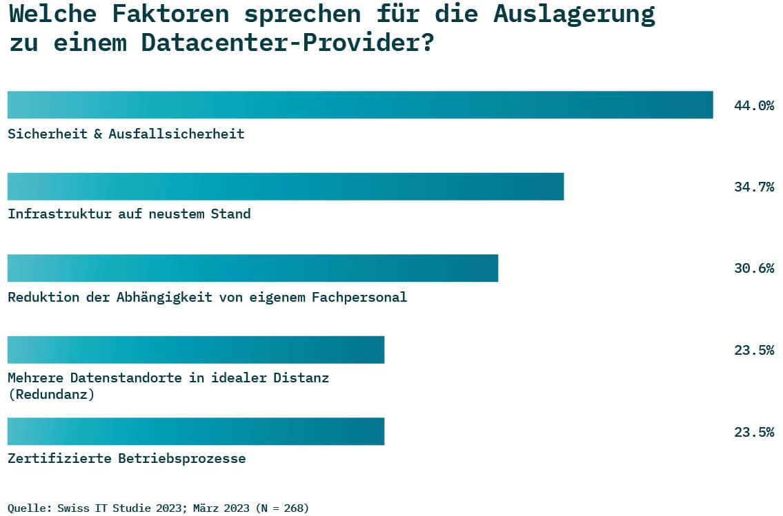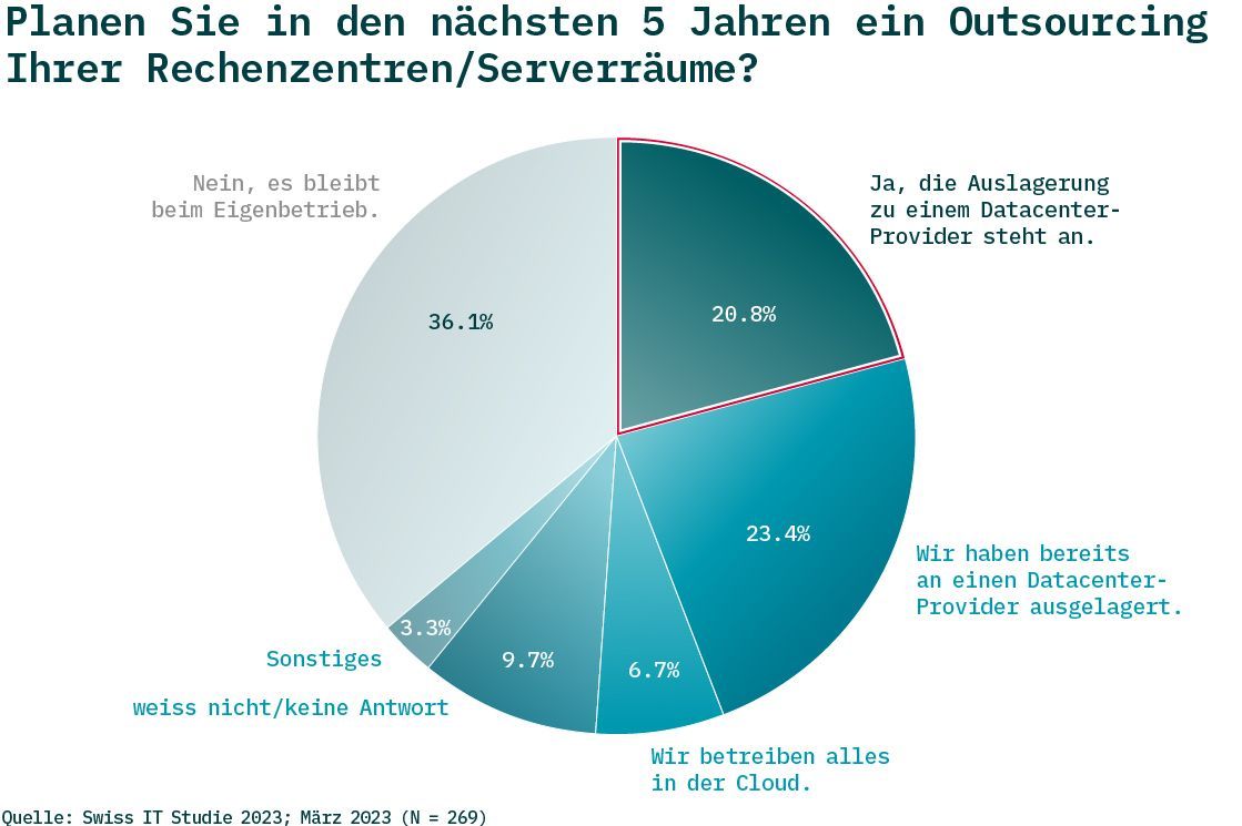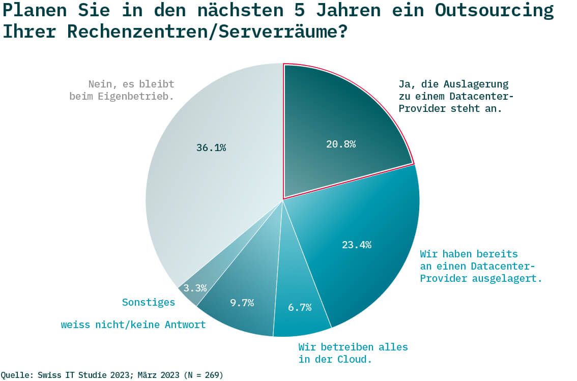 Die Swiss IT Studie 2023 zeigt deutlich, dass die Auslagerung in externe Datacenter markant zunehmen wird. 23,4 Prozent der Unternehmen haben ihre Infrastruktur bereits externalisiert. In den nächsten fünf Jahren planen weitere 20,8 Prozent, ihre Serverräume in externe Datacenter zu verschieben und ihre Rechenzentren aufzulösen.