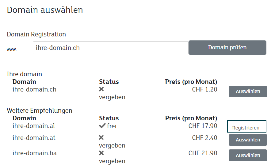 Eine entsprechende Auflistung wird angezeigt, ob Ihre Wunschdomain verfügbar ist.