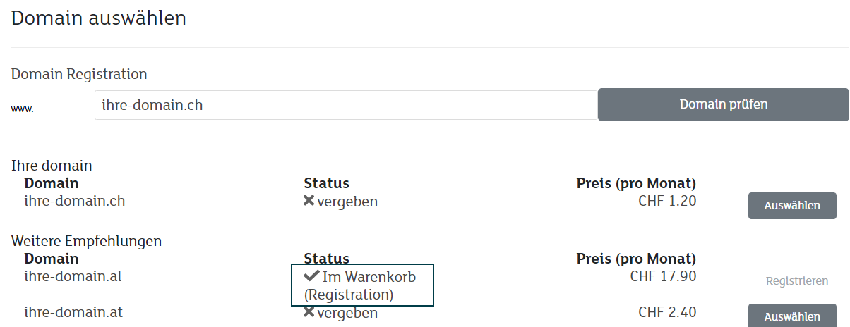 Die Domain wurde nun Ihrem Warenkorb hinzugefügt, der Status ändert sich entsprechend auf "Im Warenkorb"