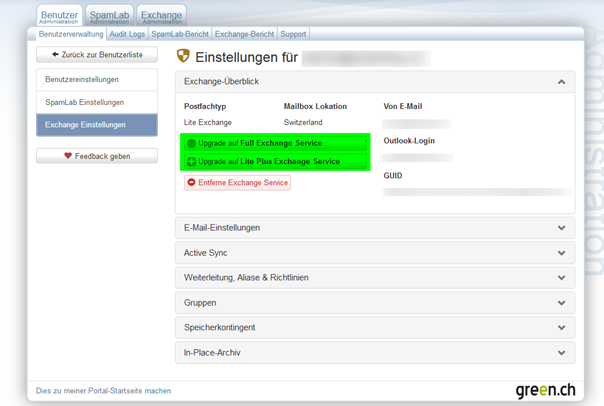 Die Unterschiede von den Lizenztypen finden Sie unter: E-Mail-Kommunikation für Ihr Unternehmen – sicher und vielseitig - Green