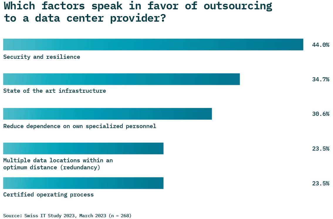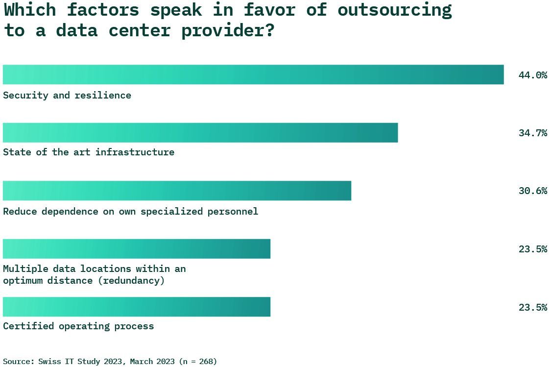 Data is a valuable resource. This much is certain. Comprehensive protection and constant availability are key requirements for data centers. In the Swiss IT Study, 44 percent of respondents said that external data centers are better equipped than their own installations when it comes to security and reliability. Keeping data center infrastructure up to date and having certified processes to ensure operational excellence are also high priorities.