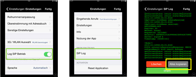 If the application shows an error, uninstall the app, download the app again and re-install the app. If this does not correct the error, activate the log SIP operation and send us the SIP logs. Select the "numeric keypad" and click on "Settings" in the upper right corner. Select the "Settings" submenu and activate the "Log SIP operation" option. Now return to the first menu "Settings" and select "SIP Log". Copy the entire content using the "Copy all" button and send us the SIP logs using the contact form.