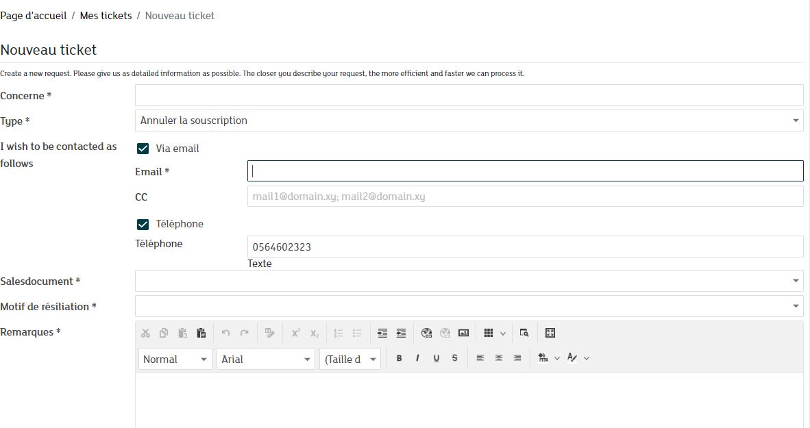 Indiquez ensuite un objet individuel pour votre demande et sélectionnez la rubrique Annuler la souscription dans le champ type de votre demande.
